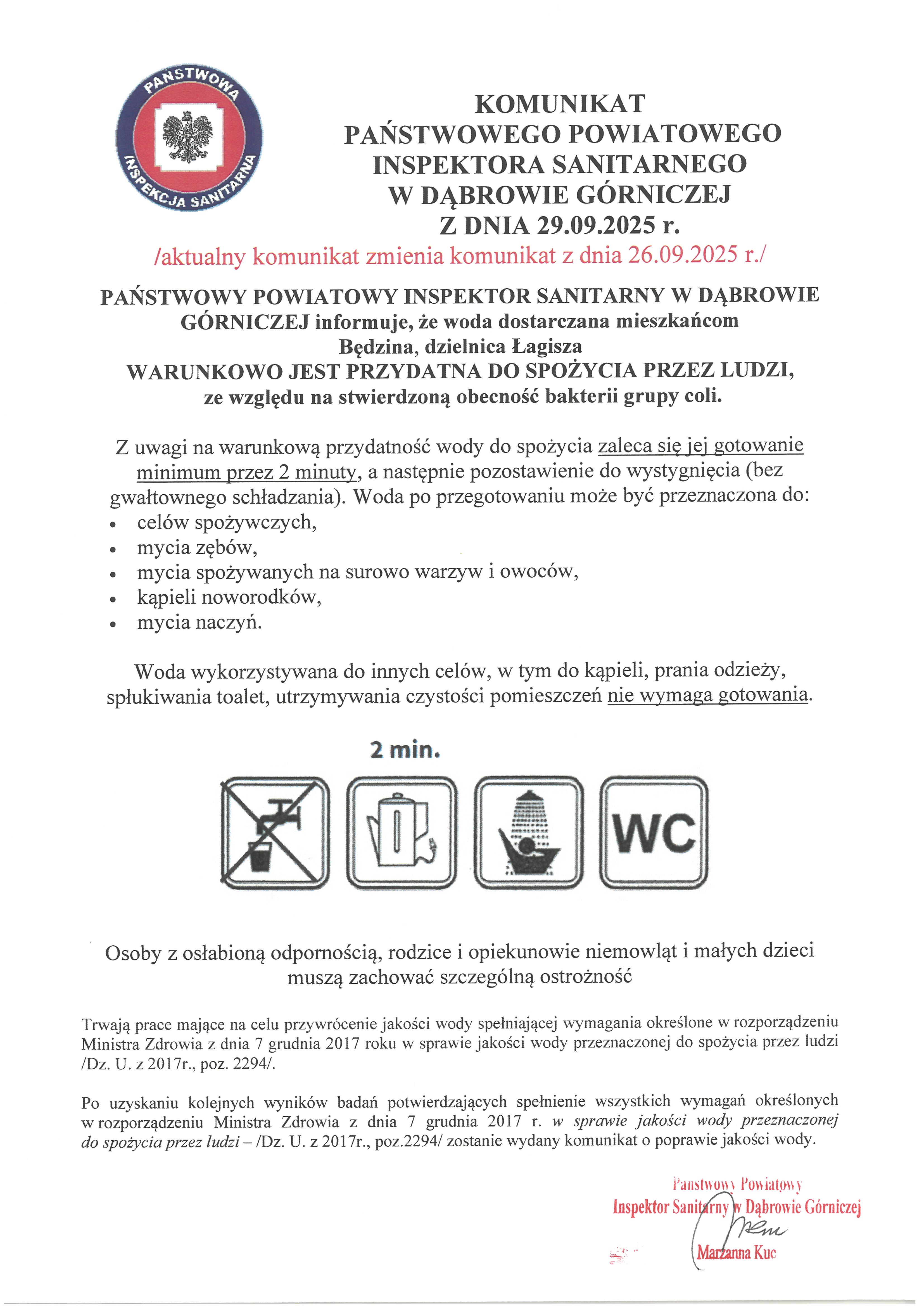 Po uzyskaniu ostatecznych wyników badań przez Sanepid w dniu jutrzejszym poinformujemy Państwa o decyzji dotyczącej przydatności wody do spożycia w dzielnicy Łagisza.