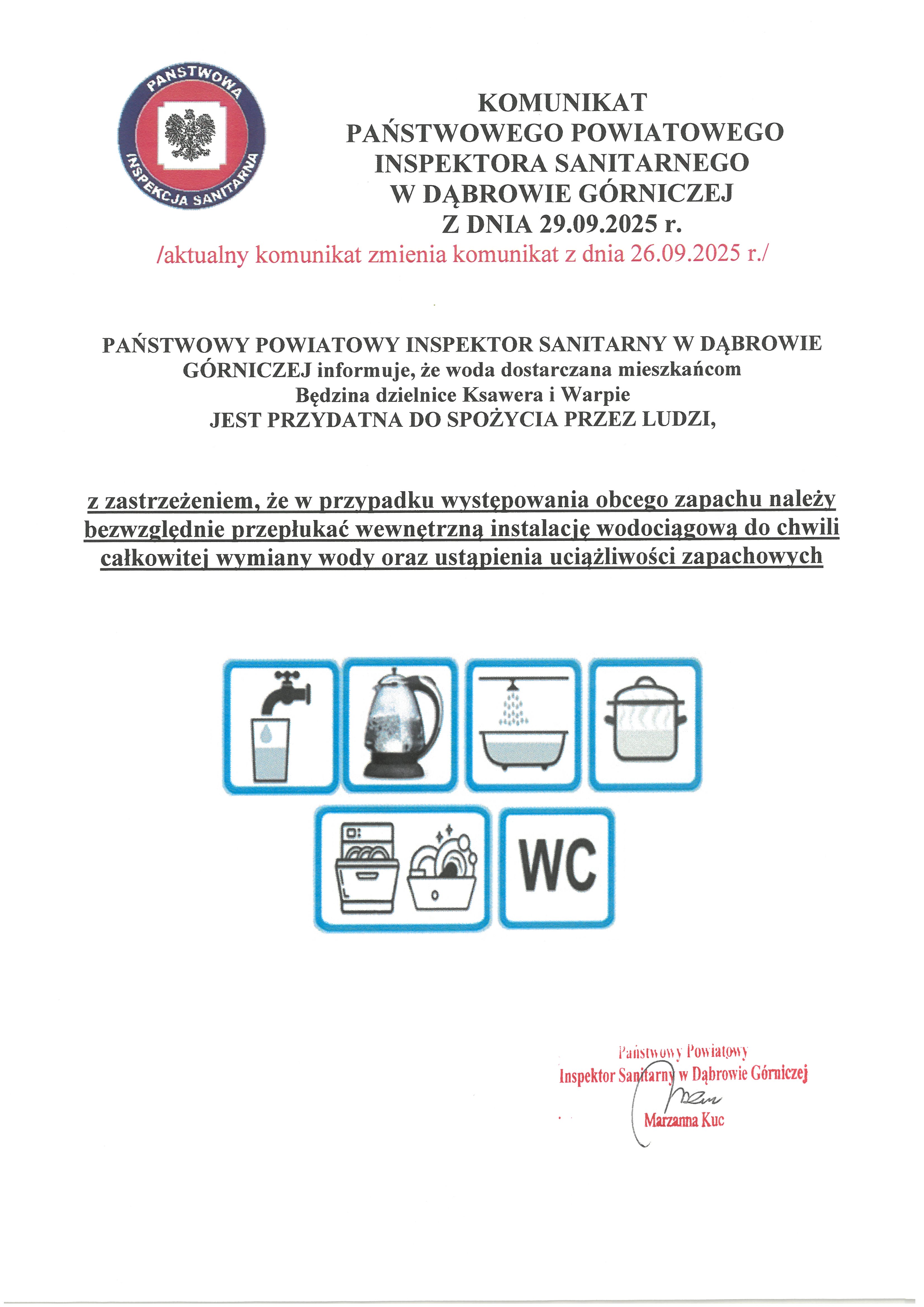 Sanepid wydał decyzję o przydatności wody do spożycia na terenie Będzina: ul. Koszelew, Podskarpie, Siemońska od Żwirki i Wigury do ul. Koszelew, al. Kołłątaja od ul. Koszelew do ul. Staszica, ul. Żwirki i Wigury nr 11, 13, 15, 22a, 26a, 28a.