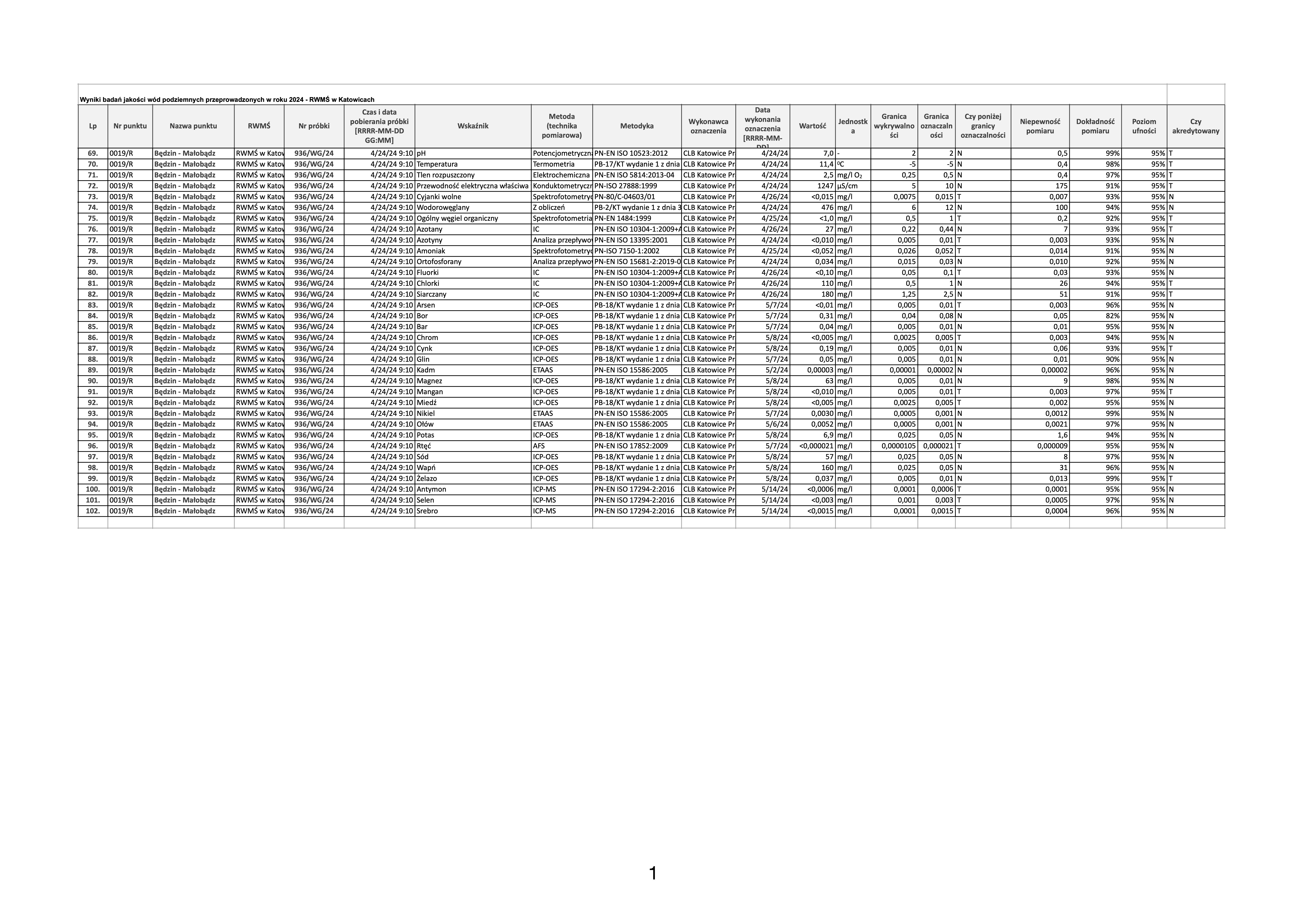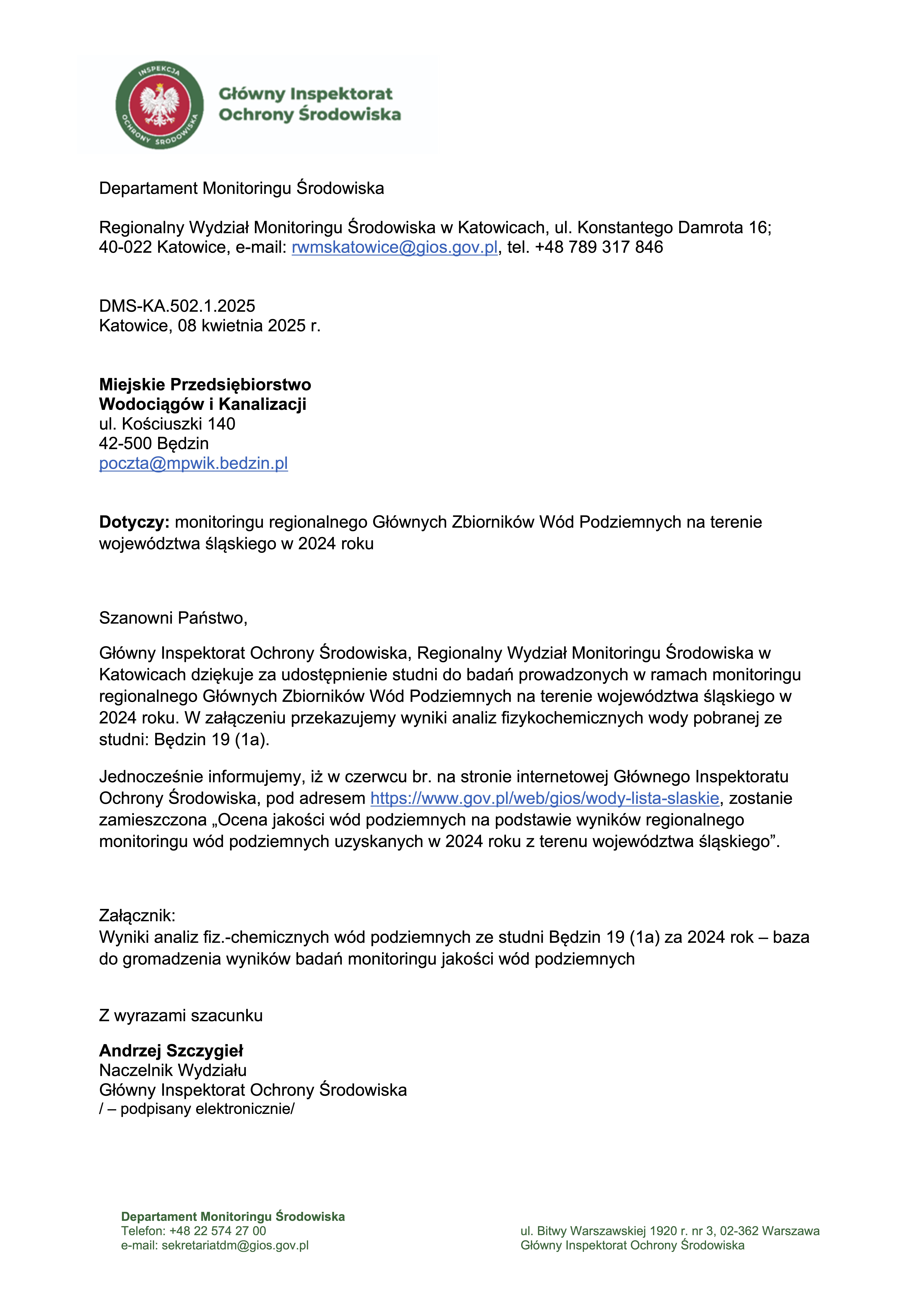 Główny Inspektorat Ochrony Środowiska, Regionalny Wydział Monitoringu Środowiska w Katowicach przesłał wyniki badań monitoringu regionalnego wód podziemnych (badania wykonane w zakresie fizykochemii wody pobranej ze studni: Będzin 19 (1a).