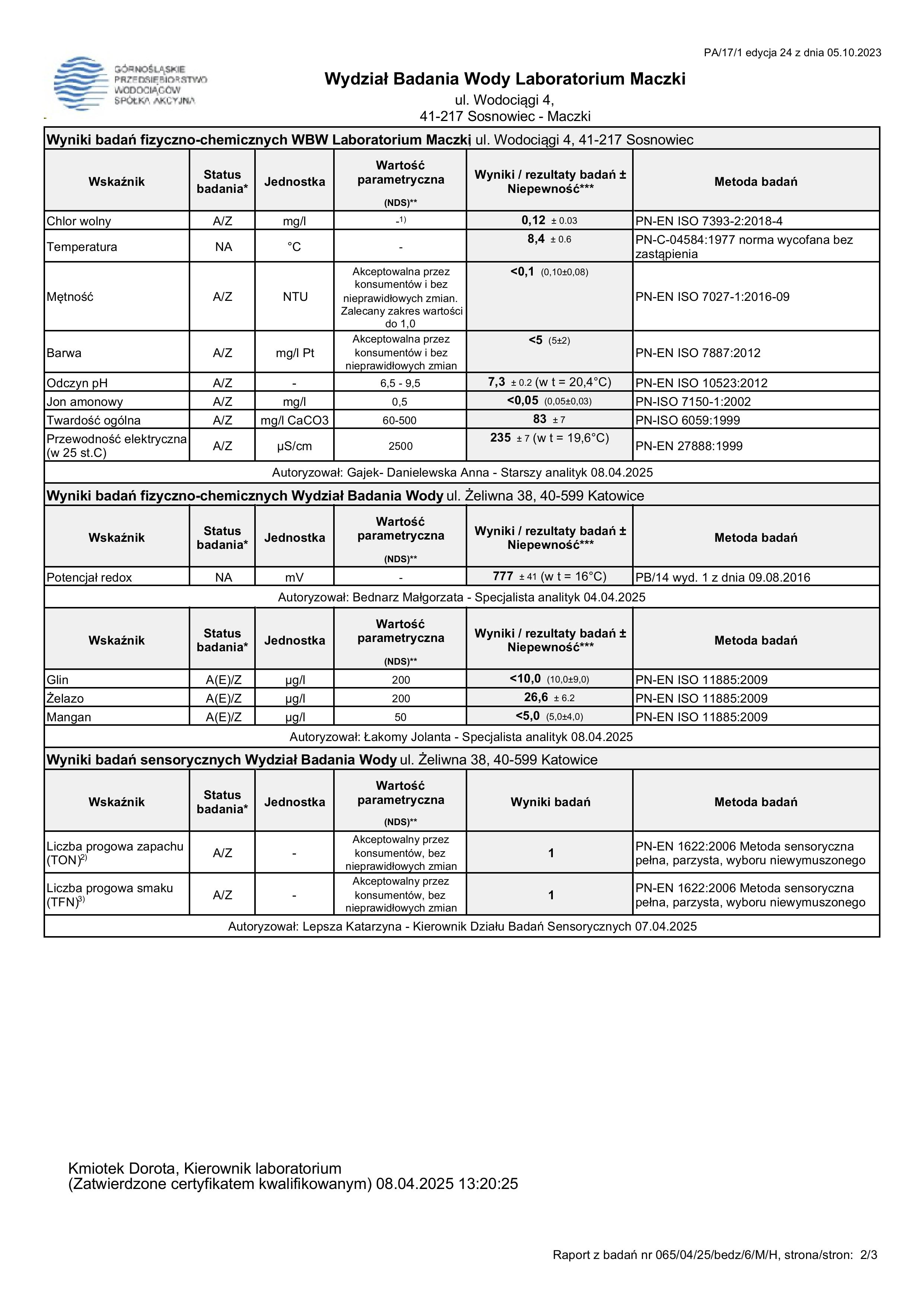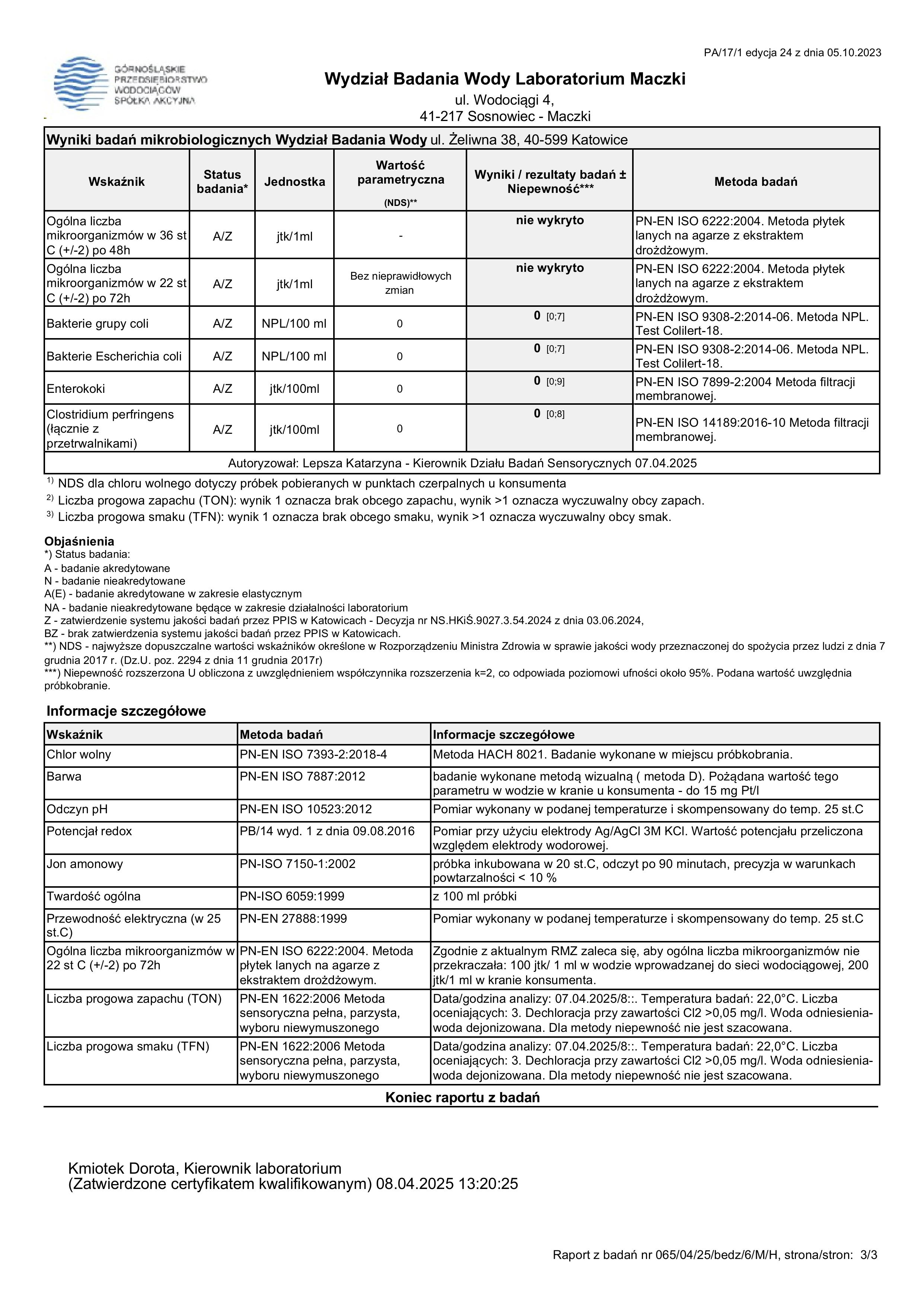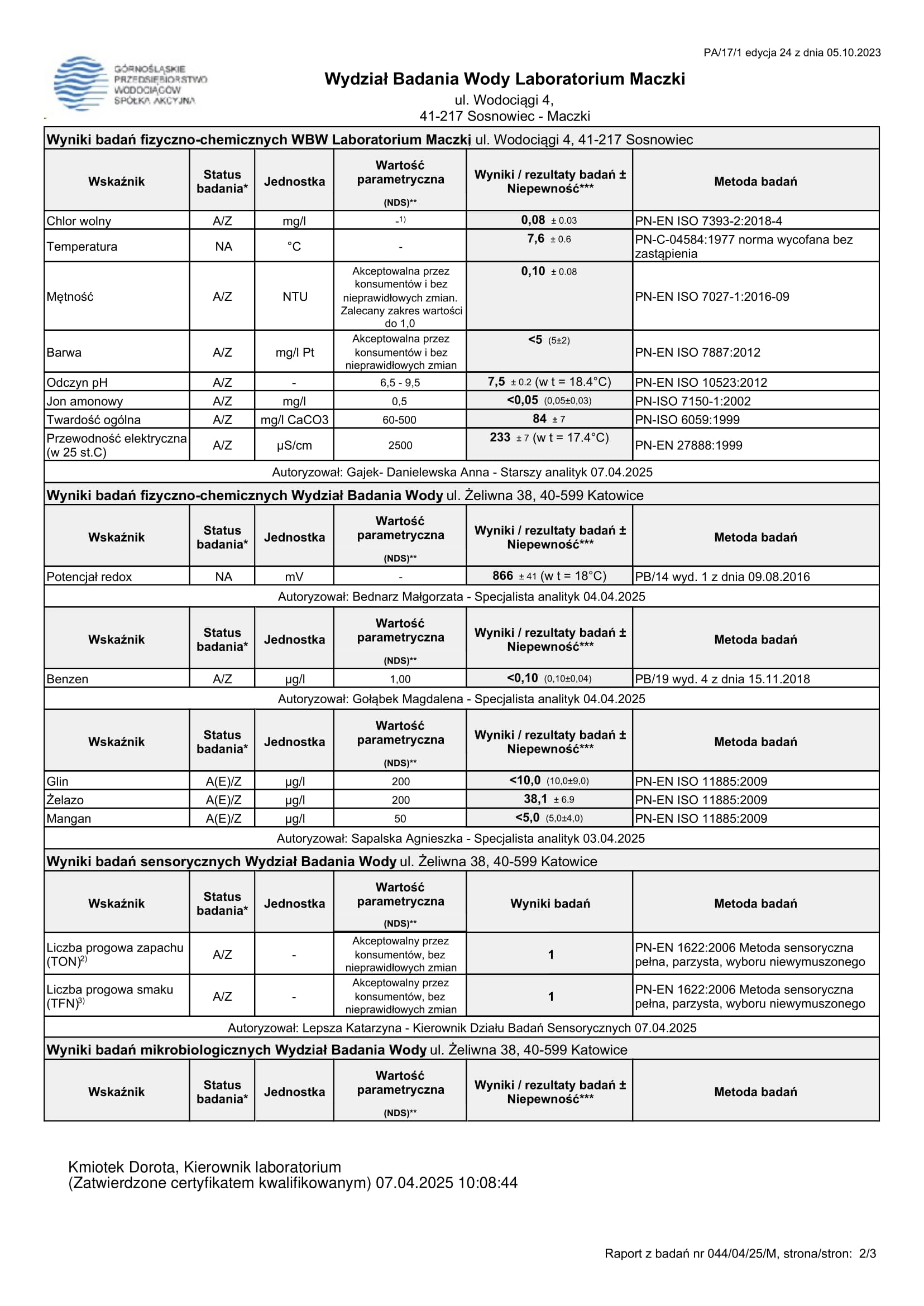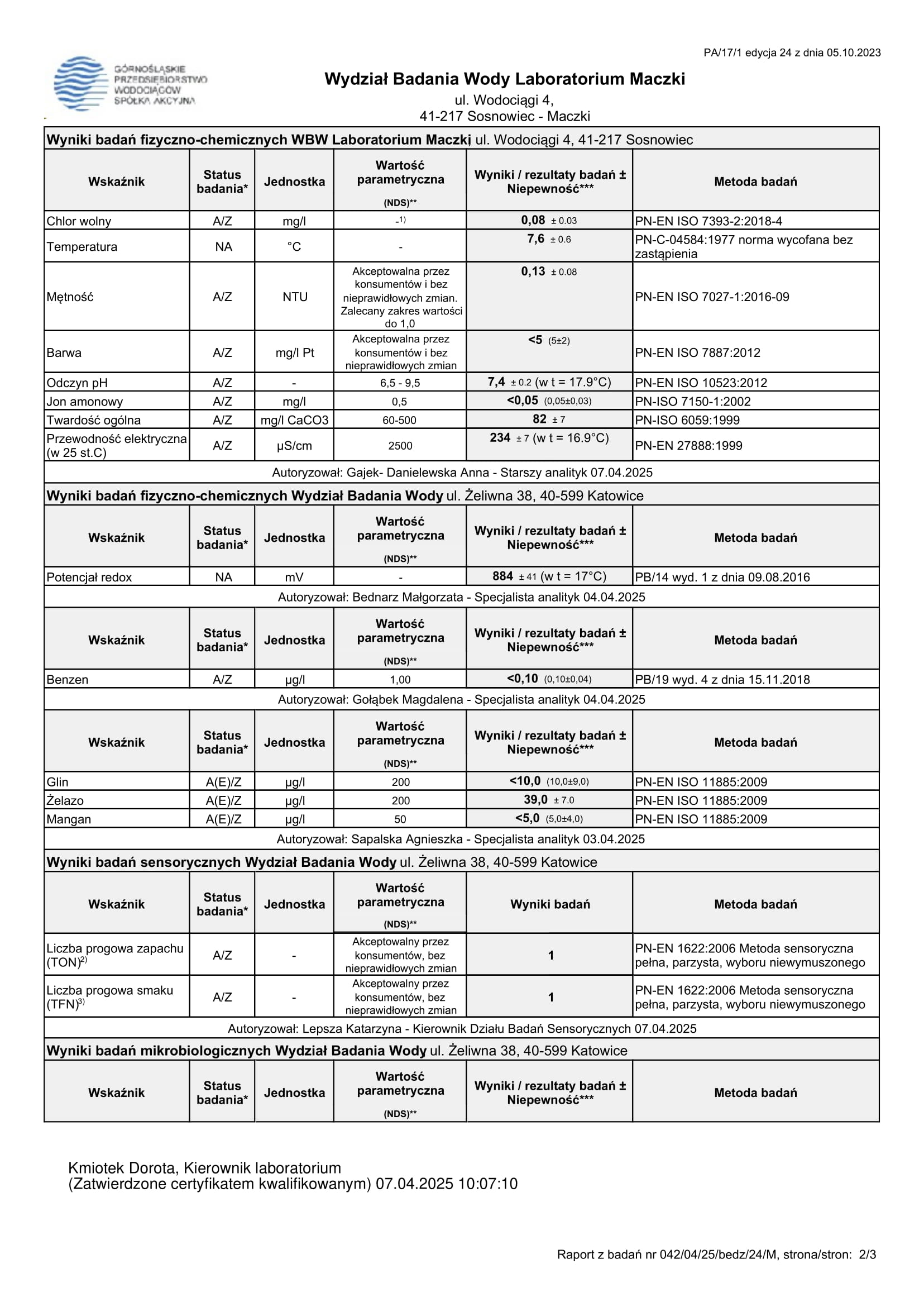 Dostępne są również wyniki badań ze studni wodomierzowych - Czeladź do Grodźca; studnia wodomierzowa - BEDZ/6 wyniki z 04.04.2025 oraz wyniki z marca.
