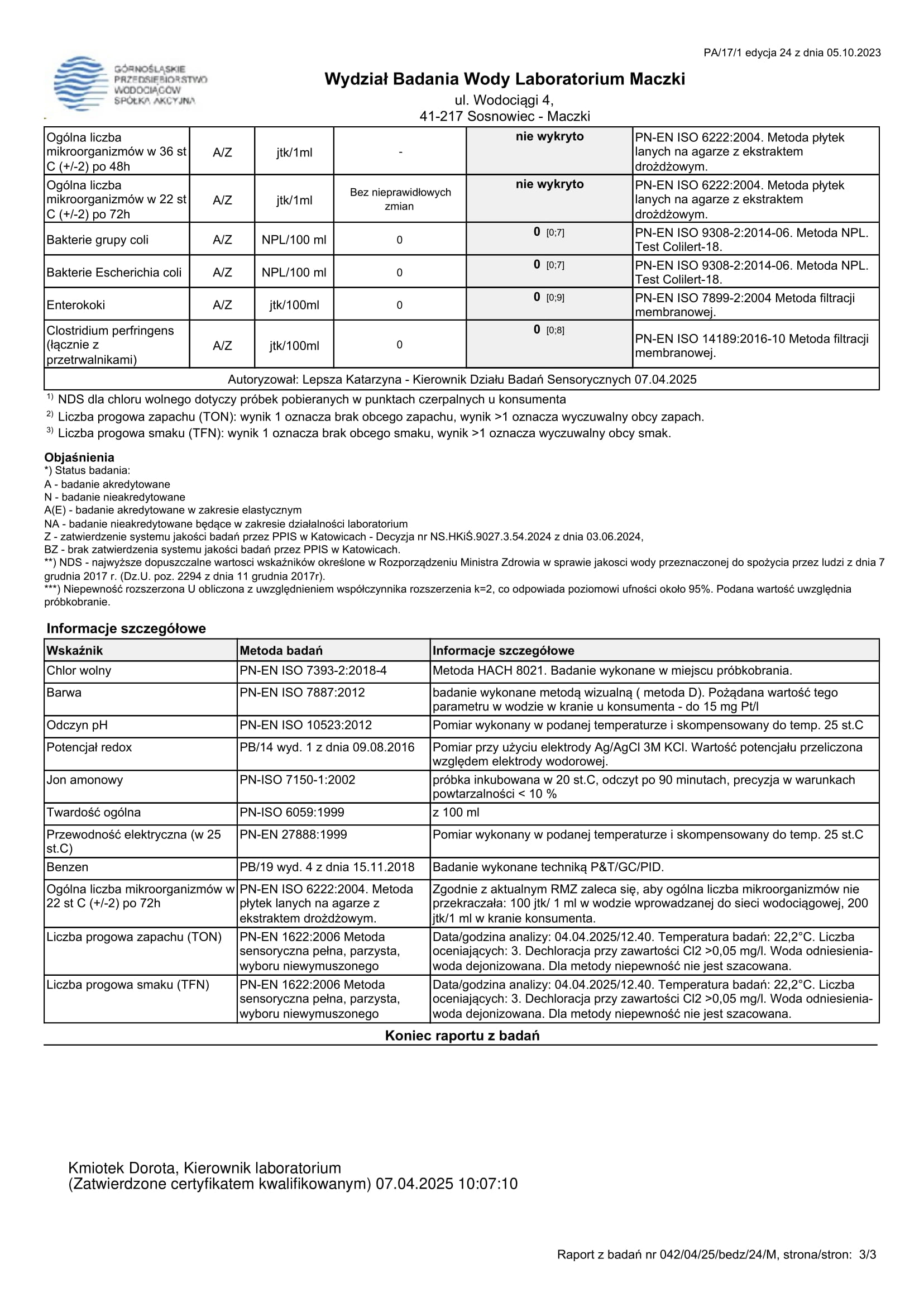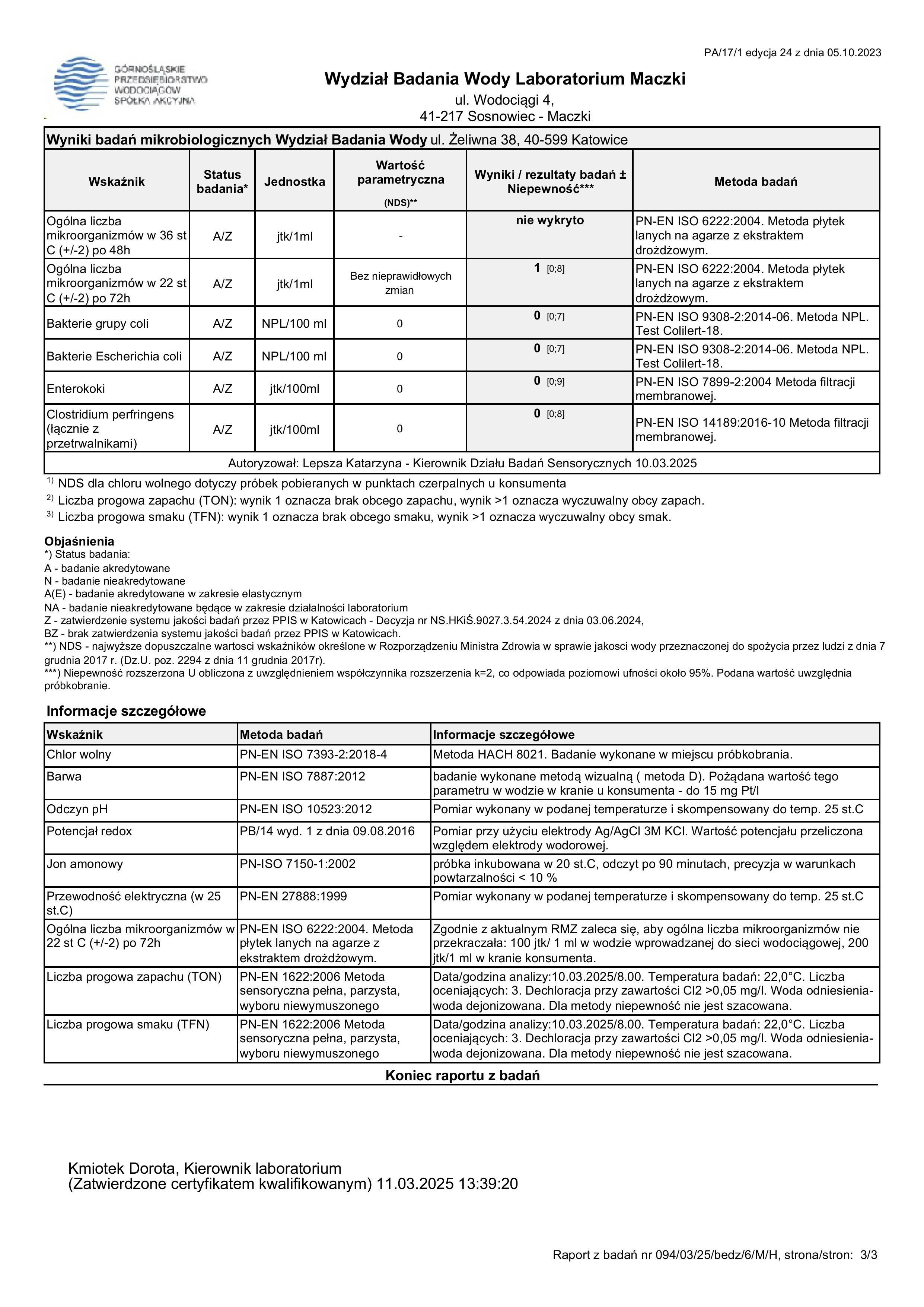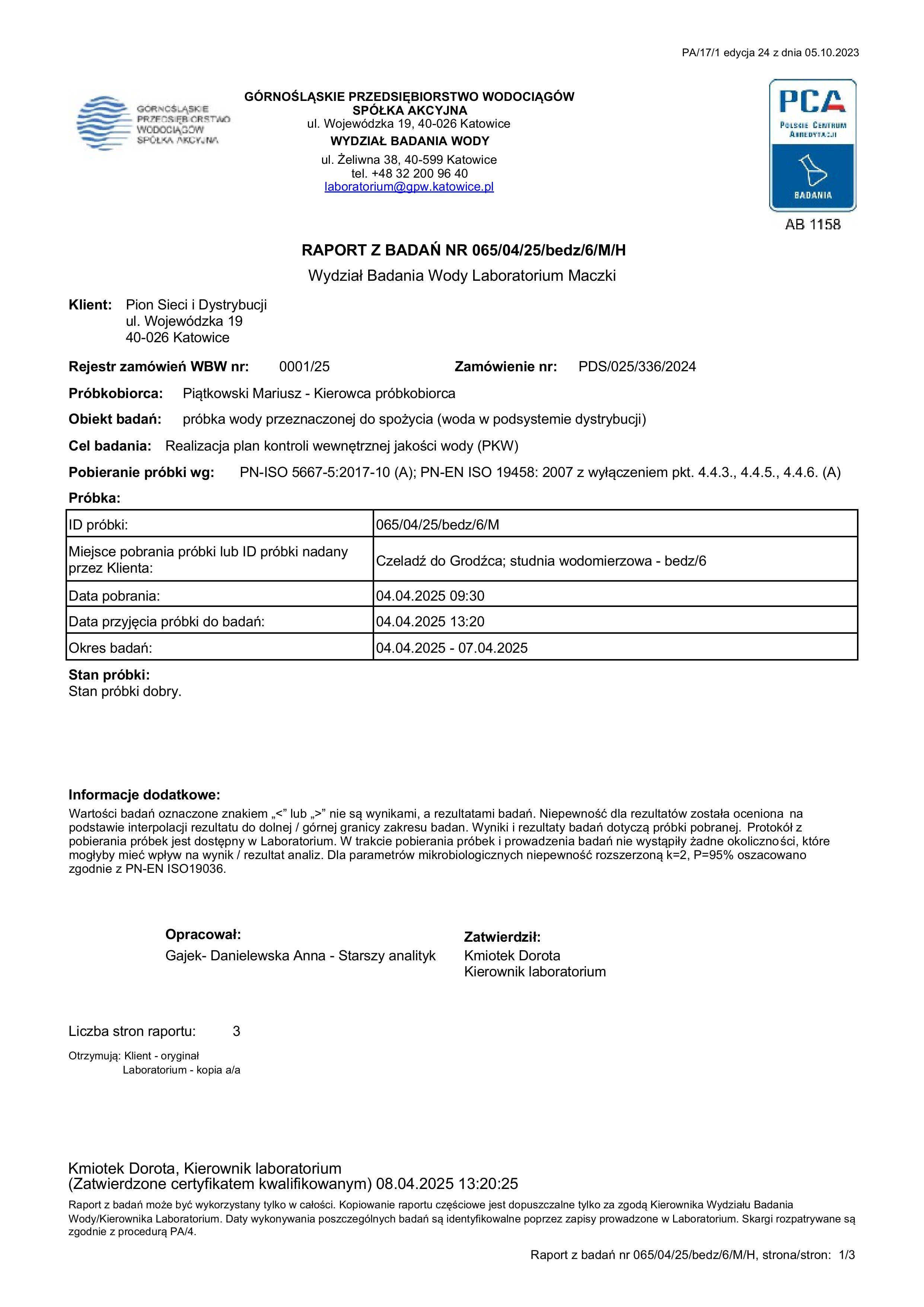 Dostępne są również wyniki badań ze studni wodomierzowych - Czeladź do Grodźca; studnia wodomierzowa - BEDZ/6 wyniki z 04.04.2025 oraz wyniki z marca.