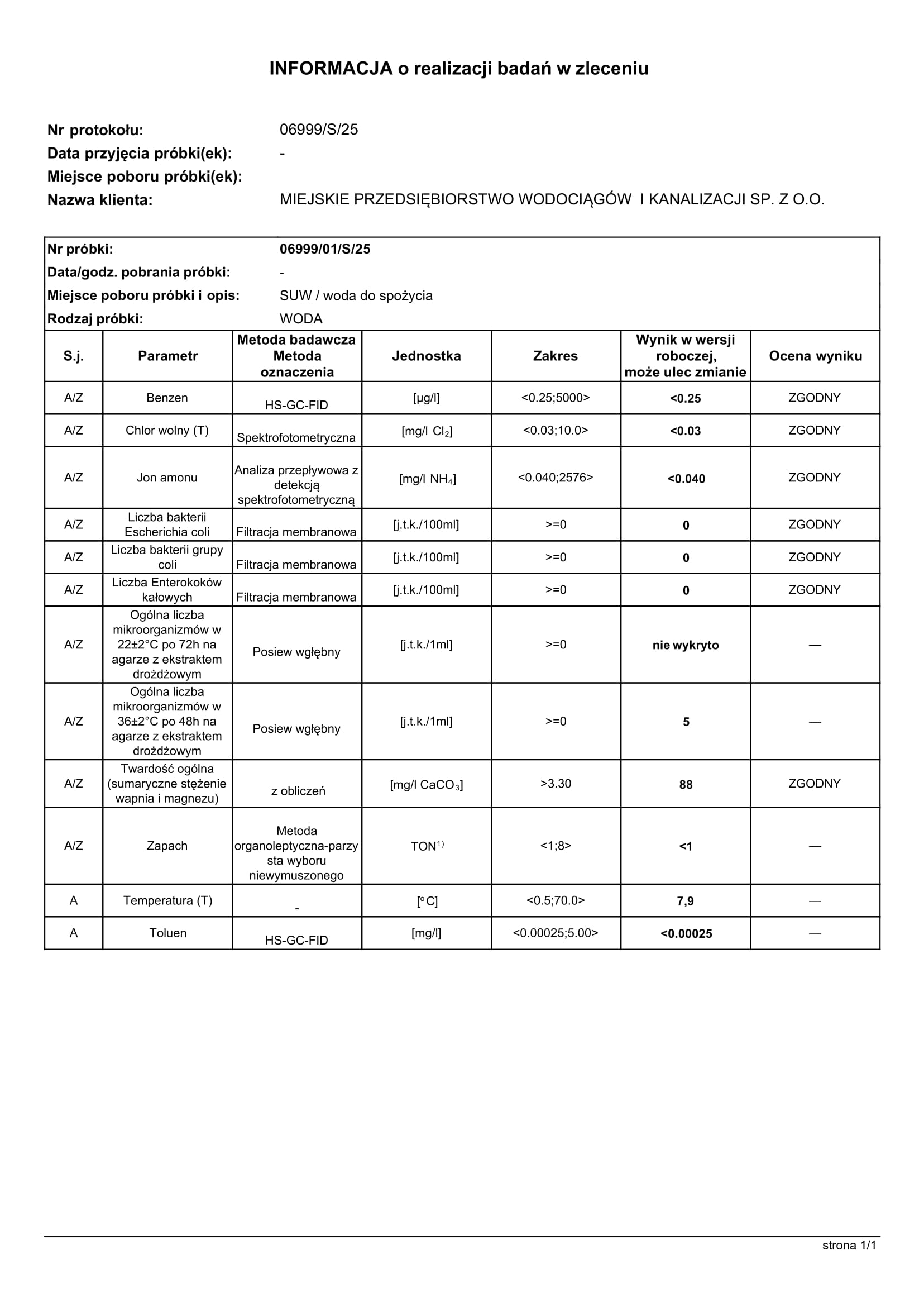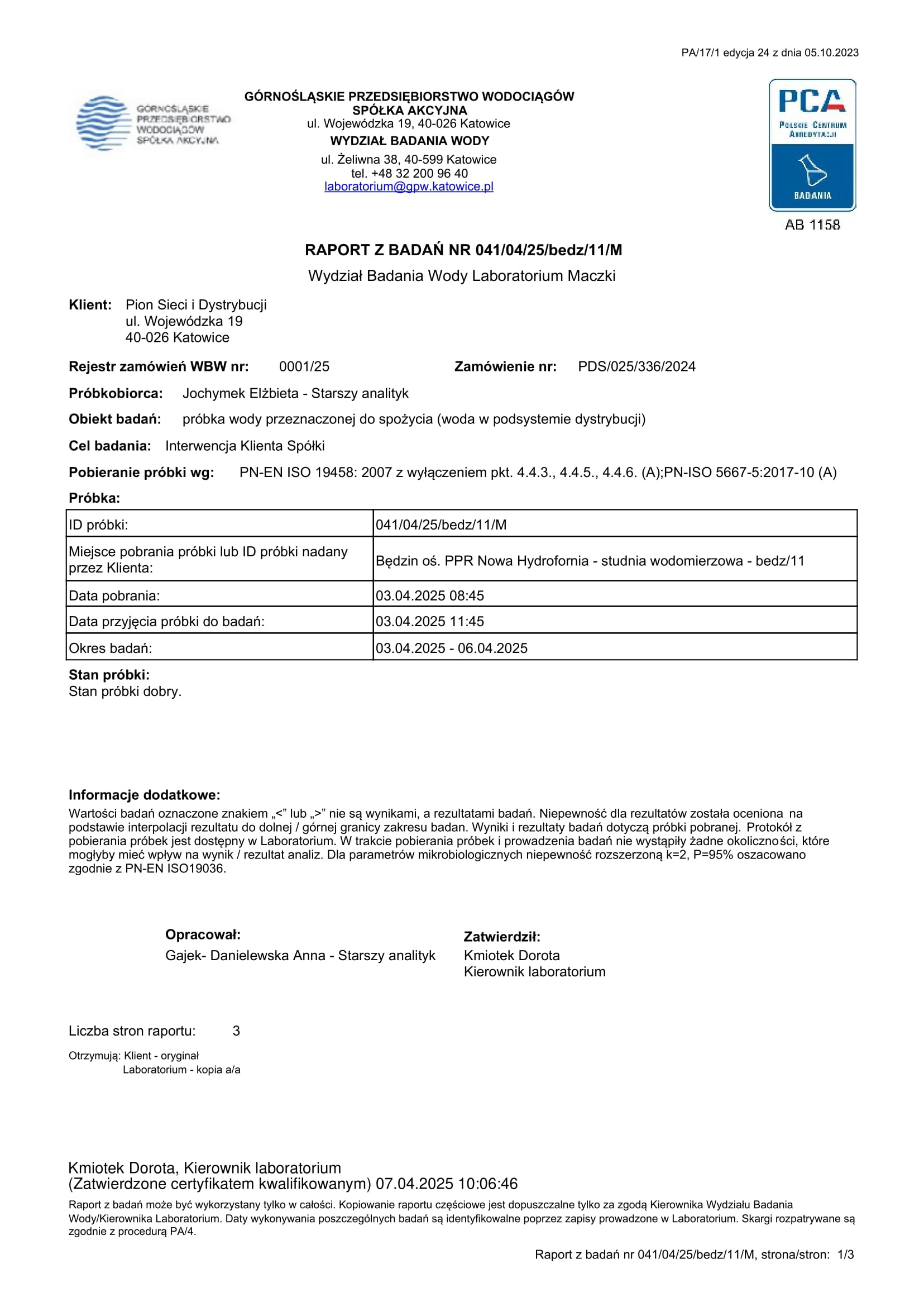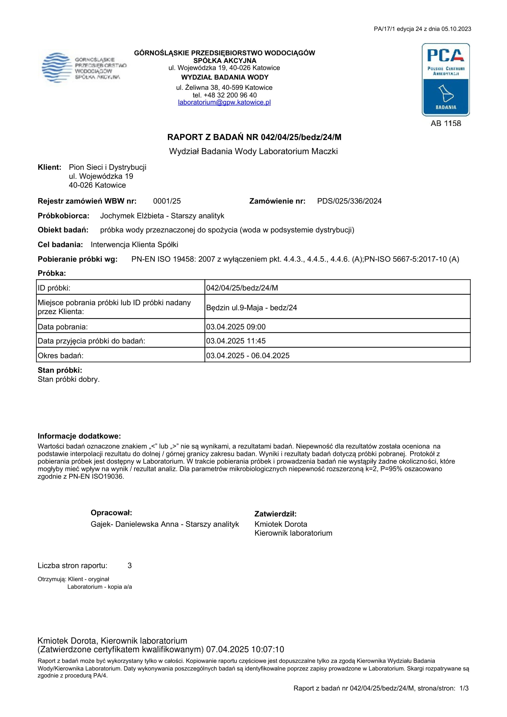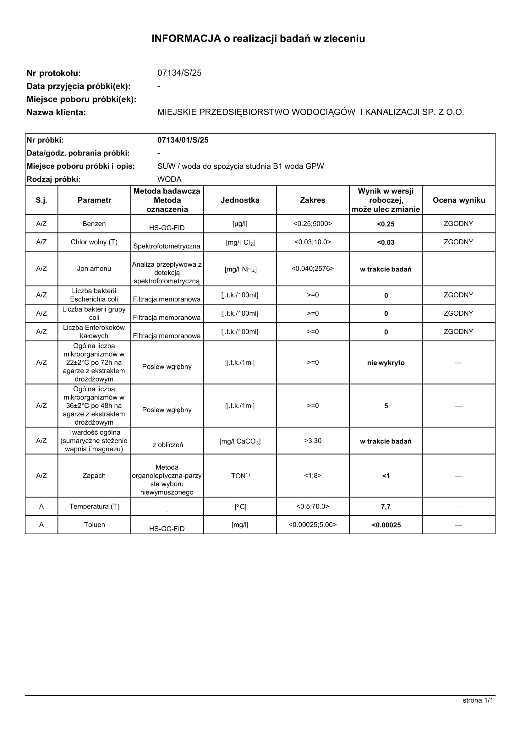 Dostępne są również wyniki badań ze studni wodomierzowych - Czeladź do Grodźca; studnia wodomierzowa - BEDZ/6 wyniki z 04.04.2025 oraz wyniki z marca.